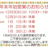 年内は30日(火)の18:00まで営業。31日(水)〜1月3日(土)まではお休みになります。年明けは1月4日(日)より通常営業となります。宜しくお願い致します。
